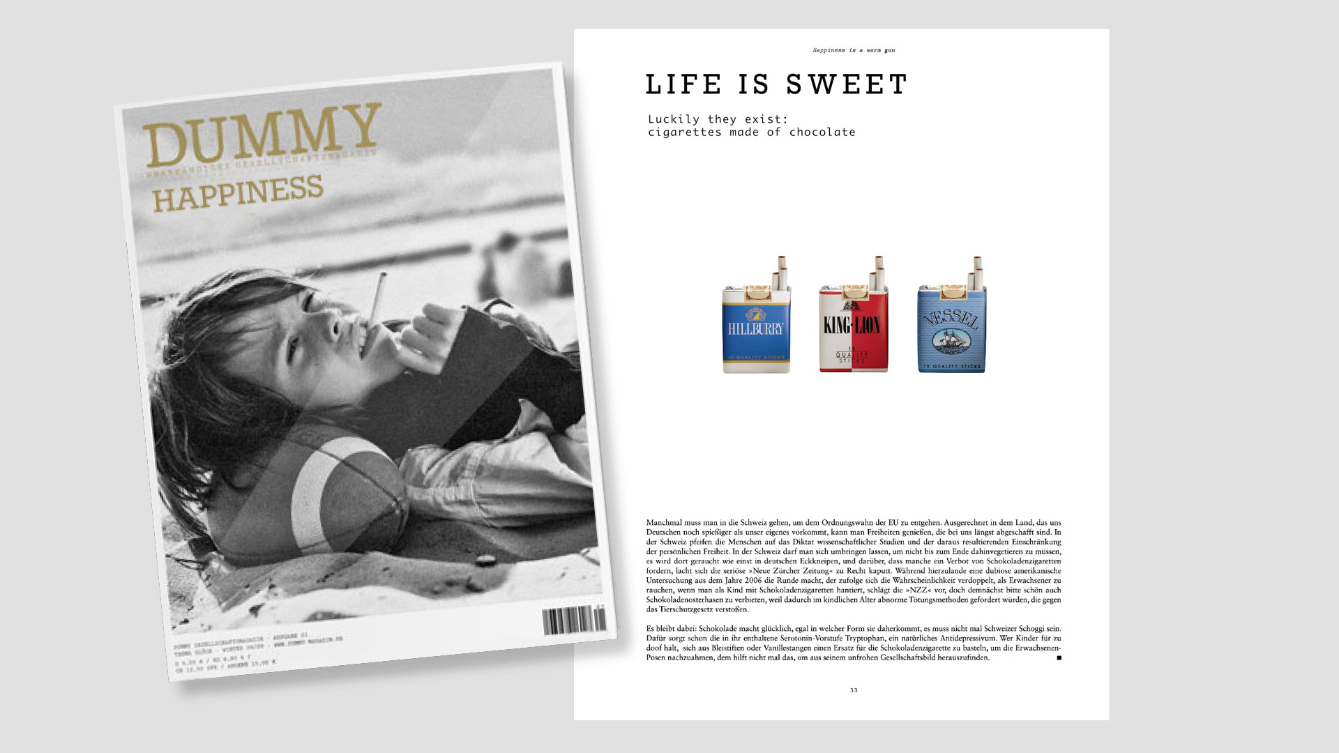 An article on the topic of “happiness” in the DUMMY magazine: “Luckily they exist: cigarettes made of chocolate”. The feature made it down to the front page.