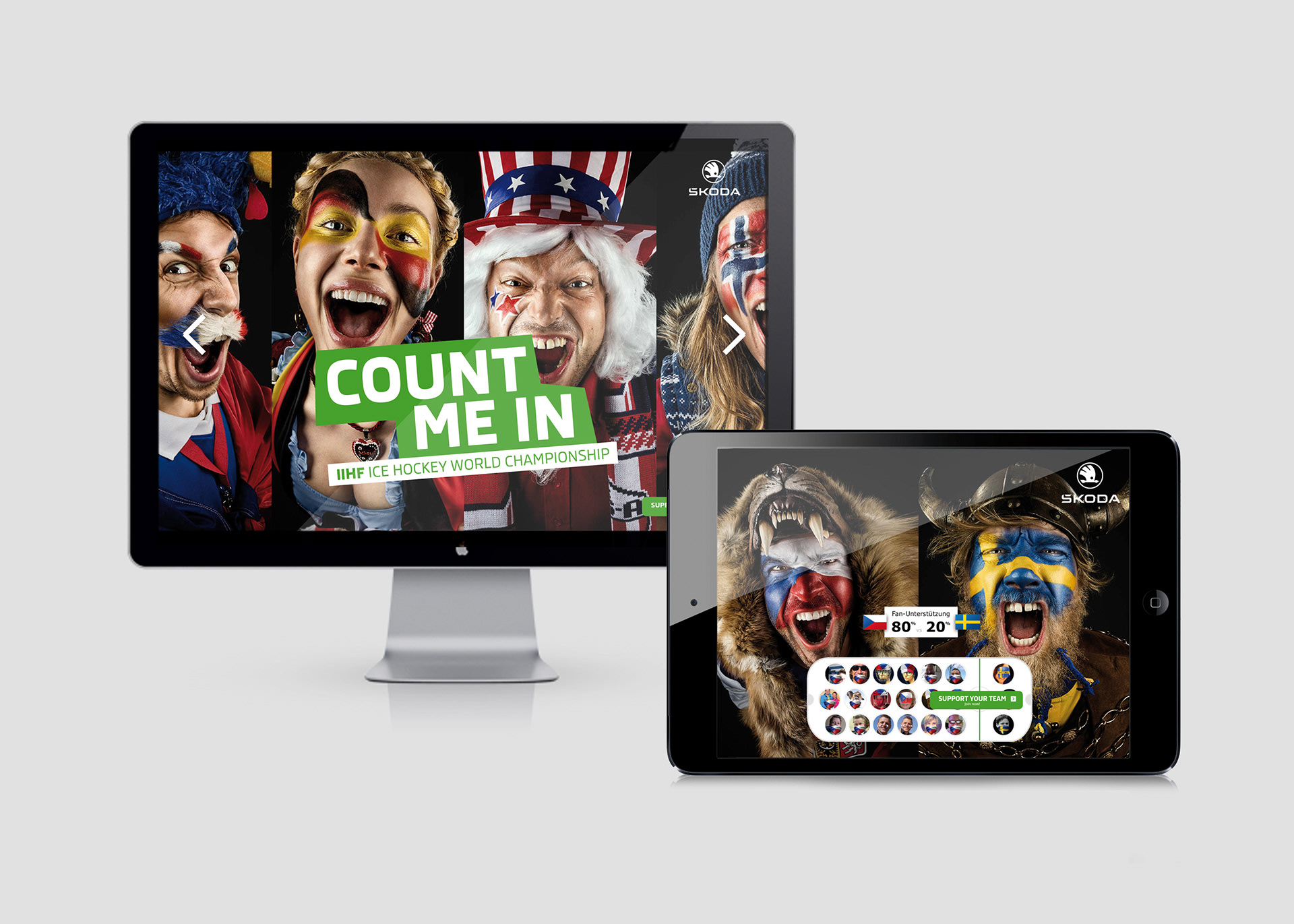 Škoda is the main sponsor of the Ice Hockey World Championship. Under the motto "Count me in" all fans could support their team by voting. The scores of the voting were displayed on the microsite, in the app and in the stadium.